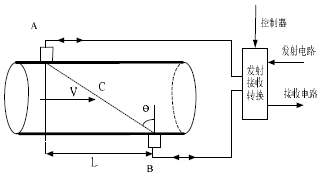 時(shí)差法計(jì)量的關(guān)鍵是要能夠獲得高精度的時(shí)間測量參數(shù),近幾年來,隨著高速時(shí)間計(jì)數(shù)處理芯片不斷出現(xiàn),使得幾十皮秒的測量精度變得可能,這對于時(shí)差法用于小口徑超聲波流量計(jì)提供了計(jì)量保證。圖1是時(shí)差法超聲波流量測量法的基本原理圖。