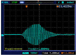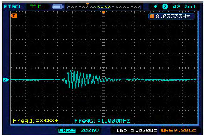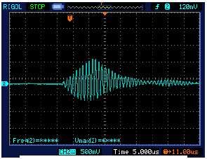 在超聲波流量測量時(shí),首先要對換能器進(jìn)行驅(qū)動,激勵(lì)換能器產(chǎn)生振蕩并發(fā)出超聲波信號,以下是分別采用1個(gè)驅(qū)動脈沖、10個(gè)驅(qū)動脈沖和15個(gè)驅(qū)動脈沖作為換能器的激勵(lì)源,圖2是1個(gè)驅(qū)動脈沖時(shí),接收端換能器所接收到的波形。可以看出,當(dāng)一個(gè)脈沖驅(qū)動時(shí),所接收到的波形比較微弱,波形很不規(guī)范。圖3是10個(gè)驅(qū)動脈沖時(shí),接收端換能器所接收到的波形。波形形狀得到明顯改善。圖4是15個(gè)驅(qū)動脈沖時(shí),接收端換能器所接收到的波形。