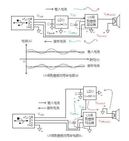 為了證明該理論,讓我們來看一個簡單的電路并考慮所示的連接。該基本電路包括三個要素,一個低壓差(LDO)線性調節器,一個微處理USB 數據線接到音頻驅動器,和一個揚聲器,所有這些都由一個連接到某個計算主機的USB插頭供電。在本例中,USB到音頻驅動器必須用3.3V供電。由于揚聲器采用音頻驅動器的輸出供電,所以音頻輸入驅動器需要+3.3V LDO,其由USB連接器供電(+5V),這似乎可以得到一個顯而易見的結論,即可將它們放置在圖1(a)原理圖所示的位置。但是,在這種框架下,驅動揚聲器工作的電流在返回到電流源驅動器時會產生一個電壓反彈,該電壓反彈會反過來作用于LDO并*終影響到USB 連接器。在本例中,把USB數據轉換為音樂的基準電壓會以音樂播放的速率反彈。由于揚聲器電感所產生的相移會增大誤差,這將和由于電流提升產生的高音量混合在一起。電壓反彈也將導致紋波出現,這將降低揚聲器發出的音質。