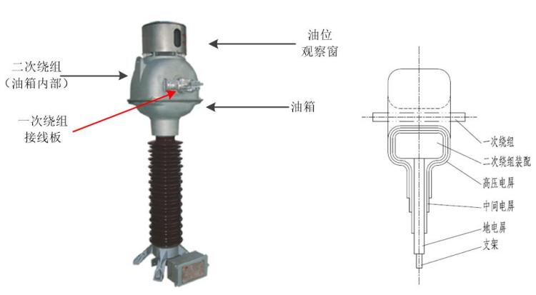 正立式電流互感器外觀與內部結構示意圖