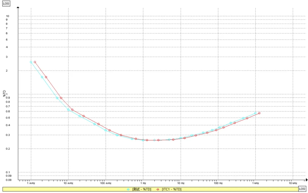 介質譜分析測試的是各個不同頻率下的電容值和介損值,并繪制成電容和介損的頻率曲線。介質譜曲線能夠更為清晰地反映絕緣的狀態,并且有助于判斷測試結果是否存在異常。介損隨頻率改變,從左到右頻率逐次增大??梢钥吹?,測試結果曲線與模型曲線十分平滑且基本一致。模型曲線與測試曲線有偏移的原因是溫度不同。